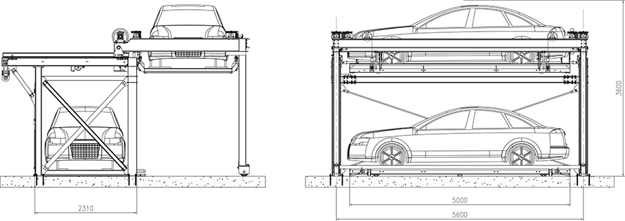 上下兩層車位,上層車位取車,下載車板無車可直接停放在下車臺板上,下載車板有車,則下層車位縱移旋轉(zhuǎn)至通道,上層載車板下降至地面,車輛便可自由進(jìn)出;下層停車可直接入庫;